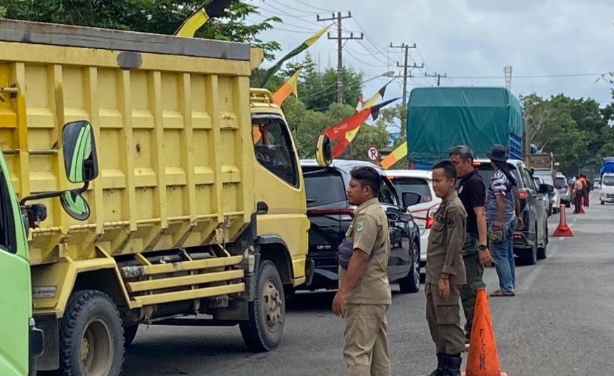 KUALA KAPUAS- Satuan Polisi Pamong Praja dan Pemadam Kebakaran Kapuas bantu arus lalu lintas di kawasan Bundaran Besar kota Kuala Kapuas, Sabtu (13/1/2024).
